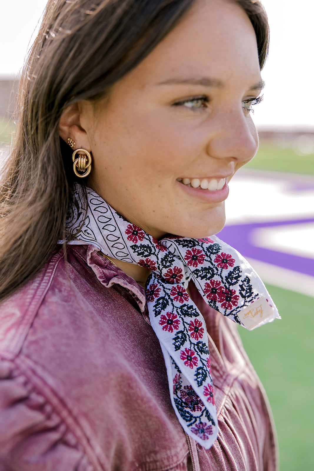 Tie around your neck for a cute & fashionable neck tie, loop in your boot or tie on your purse. The options are endless to dress up your favorite Game Day looks with our Frilly's! Frilly's are 12in x12in cotton square fabric that are embroidered with black and maroon floral around the entire boarder of the square.