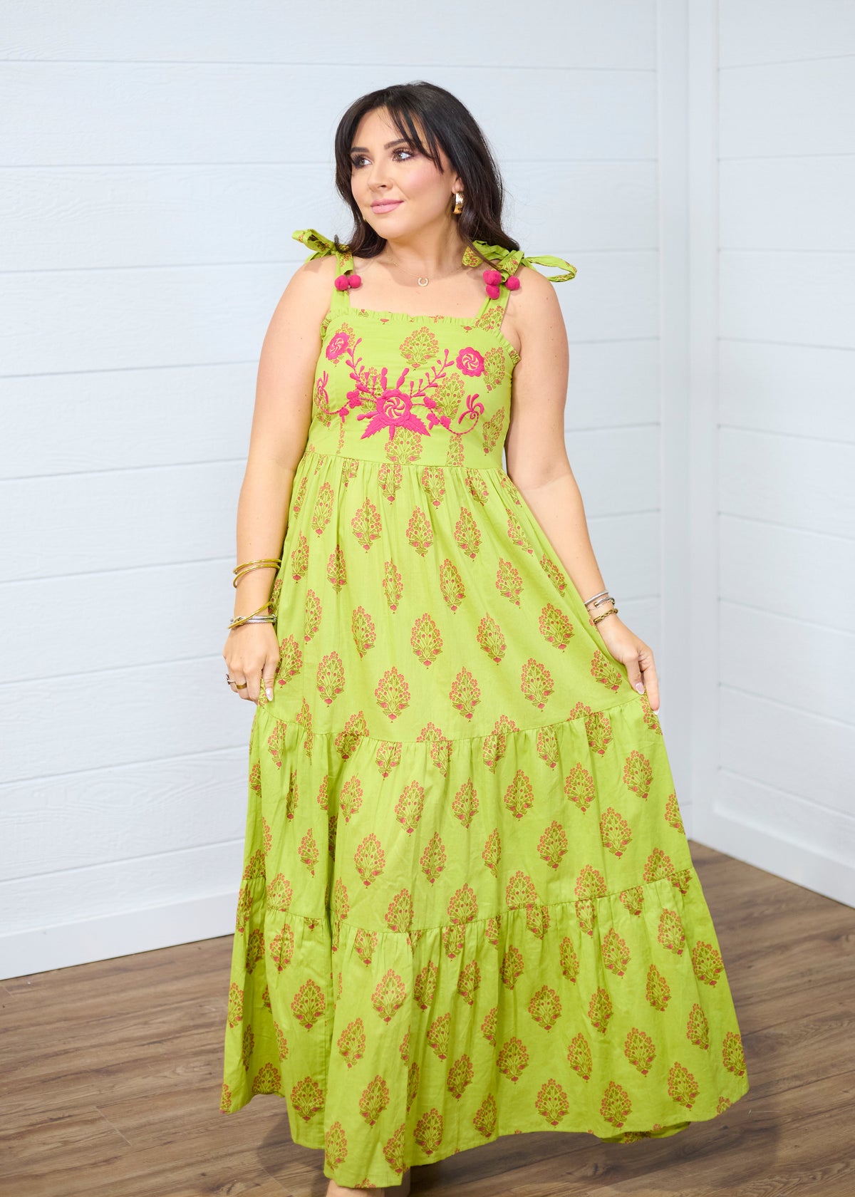 The Addison Maxi is the perfect addition to your spring and summer wardrobe. Pair with heels for church or barefoot at the beach! This dress is a chartreuse floral stamped maxi dress with pink embroidery and tie straps with pink pompom tassels.