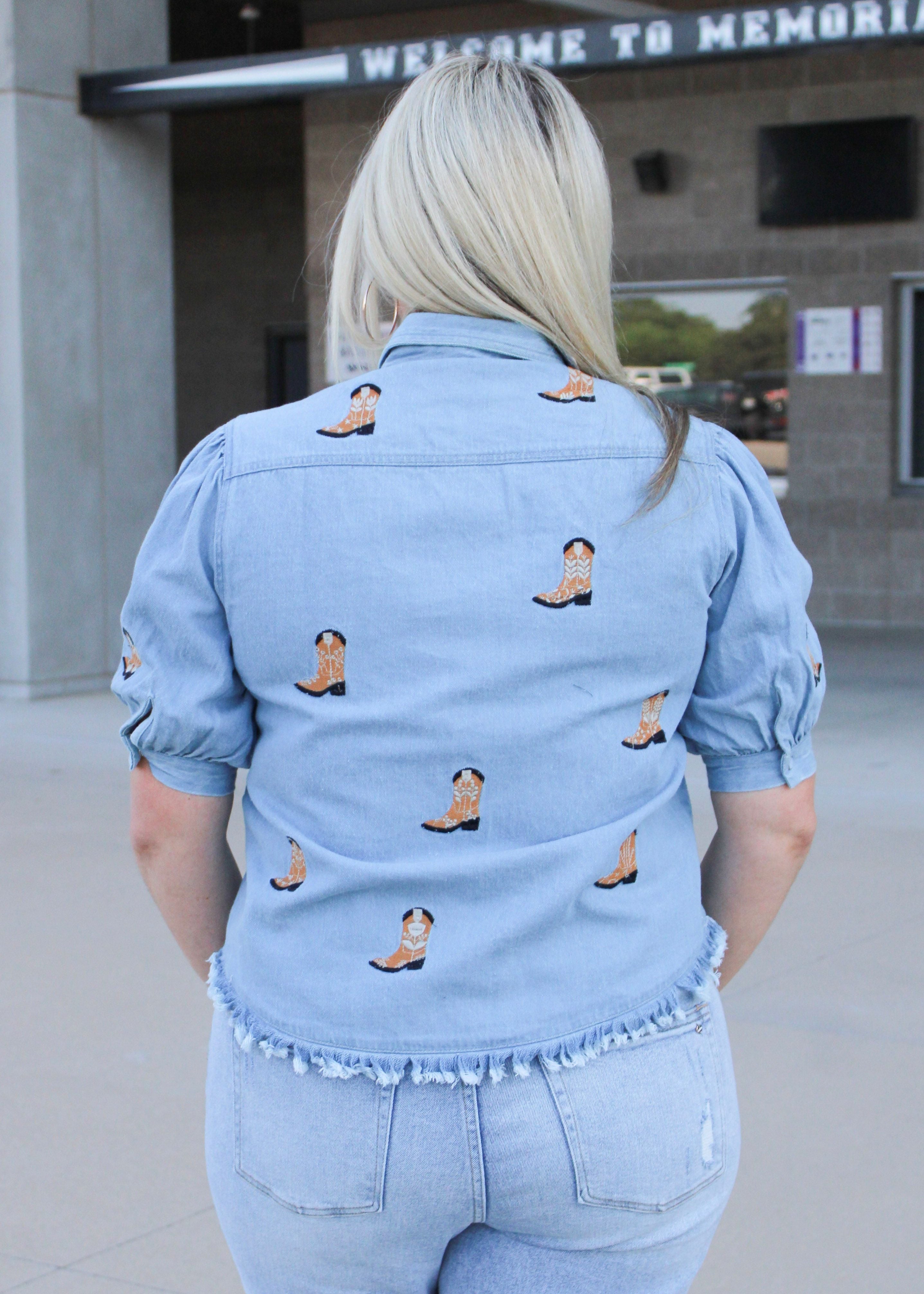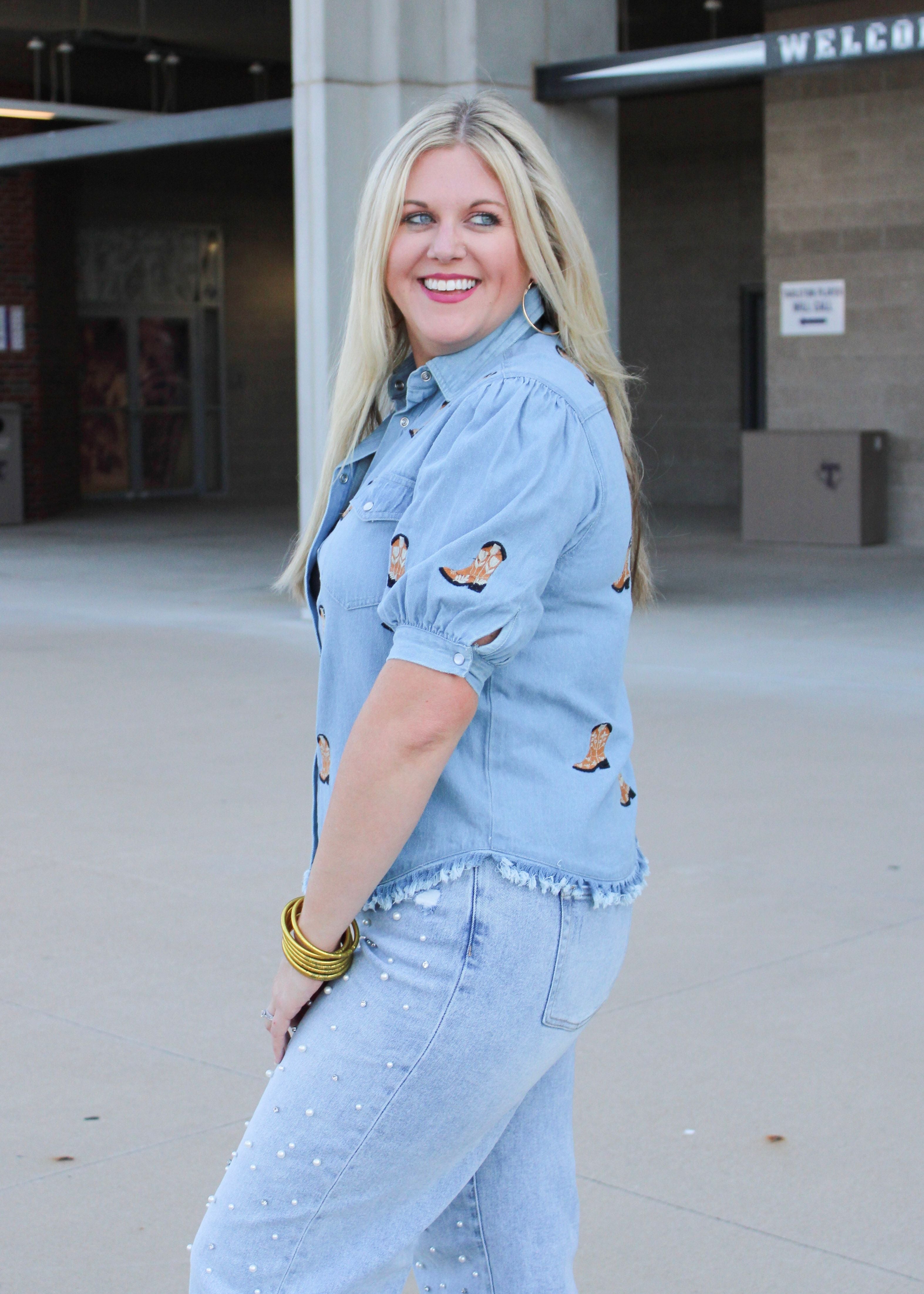 Boot, scoot, and boogey into the cutest game day fit. This denim short sleeve top is the perfect top for game day or a day out. The burnt orange embroidered boots elevate the top, and the puffy sleeves add a unique flair to this one-of-a-kind top.