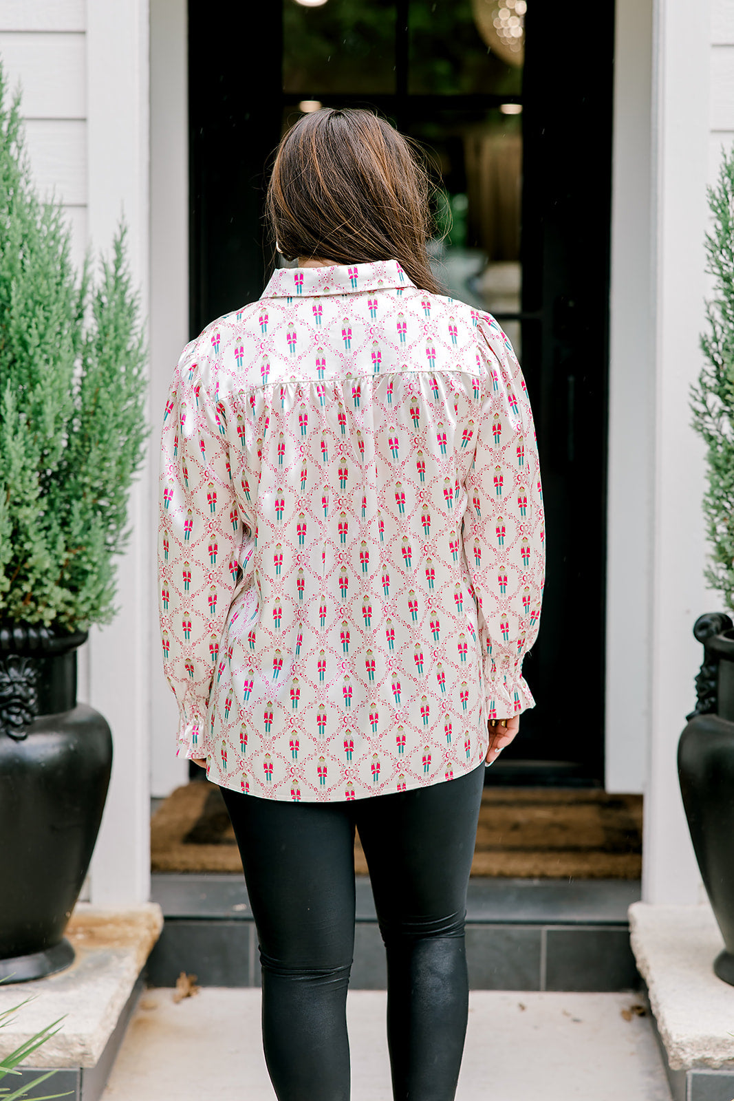 Perfect for dressing up seasonal celebrations, it adds a festive sparkle to any outfit. Step into the holiday spirit with this long sleeve satin Nutcracker bow button top, featuring whimsical charm and a luxe finish.