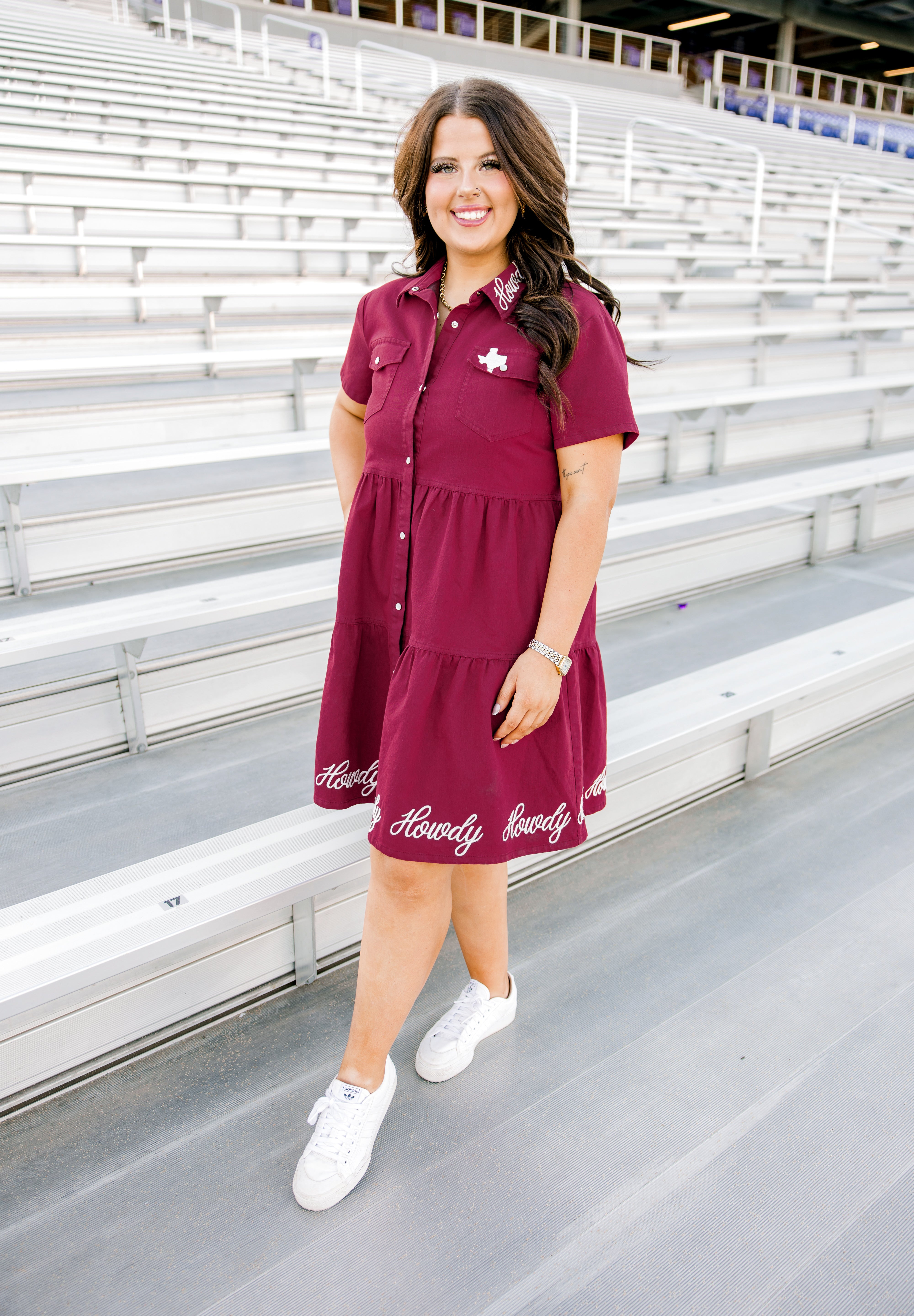 Make every game day or gathering feel unforgettable with a dress that radiates Southern spirit and charm. This maroon button-front tiered dress features playful "Howdy" embroidery along the hem, short sleeves, front chest pockets, and bold Texas-inspired details including a stitched state patch and statement collar embroidery.