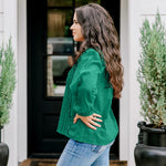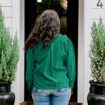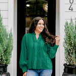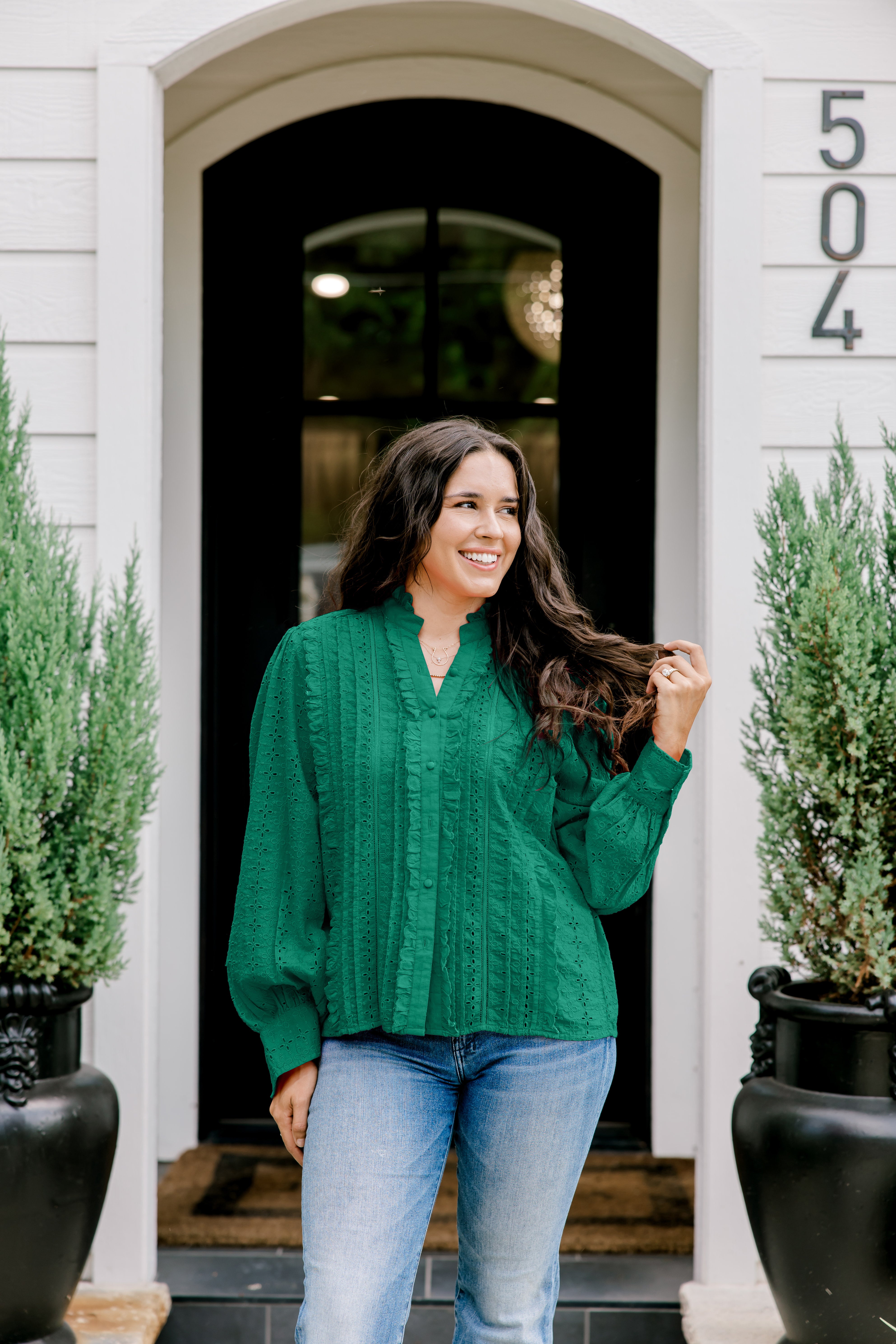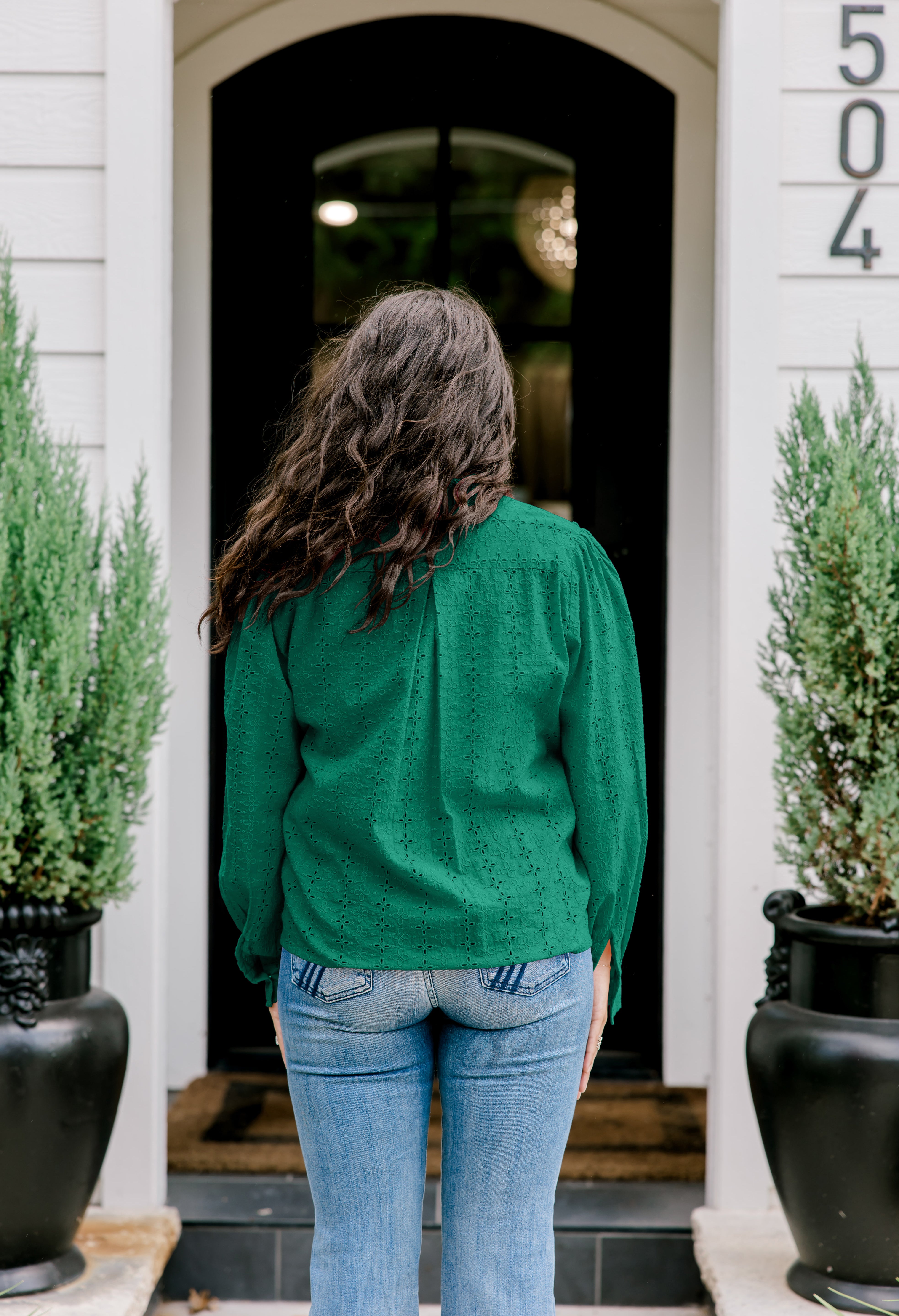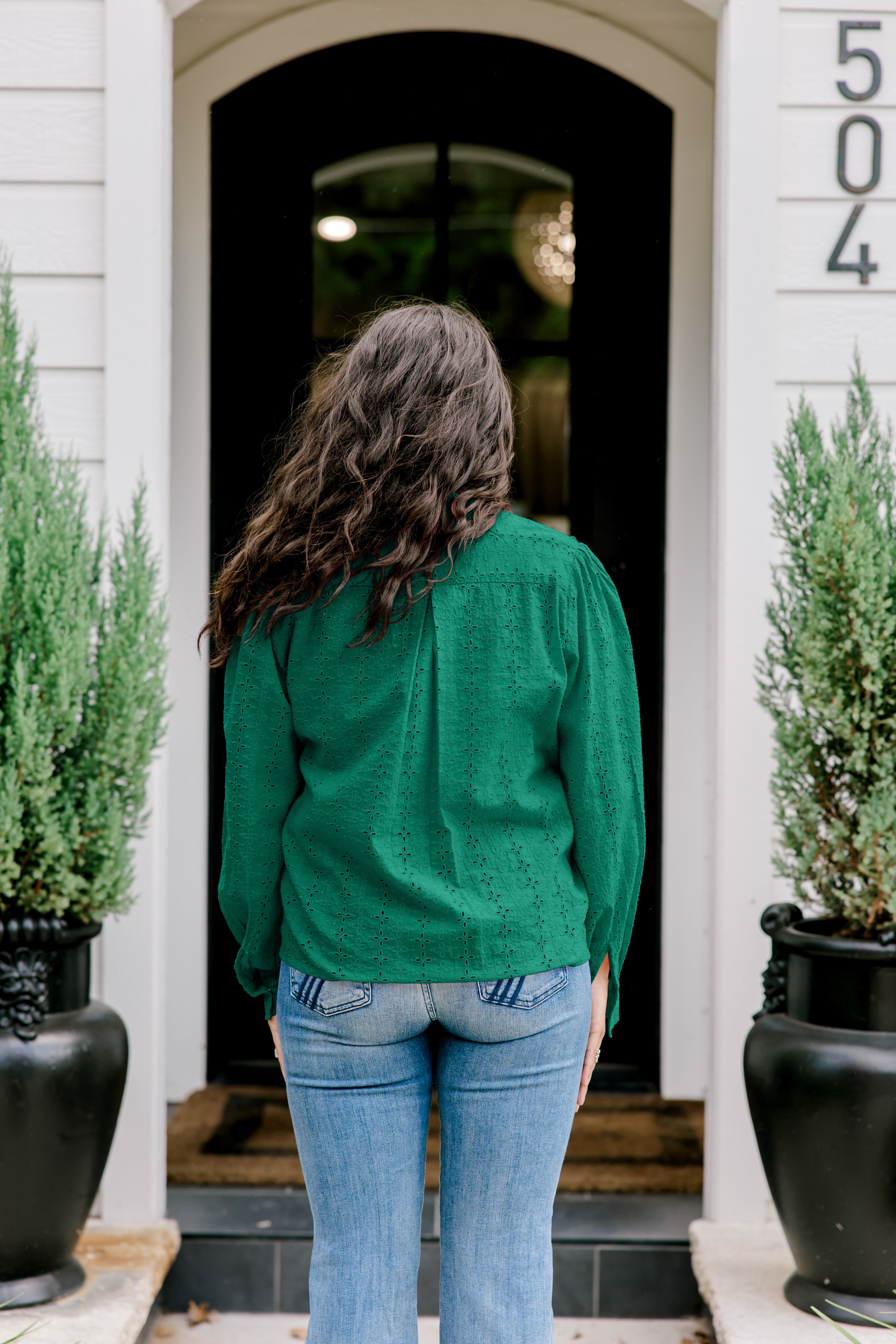 Bring festive charm to your wardrobe with this green eyelet long sleeve top, featuring delicate detailing and a timeless holiday hue. Perfect for pairing with skirts or jeans, it’s a versatile piece for all your seasonal celebrations.