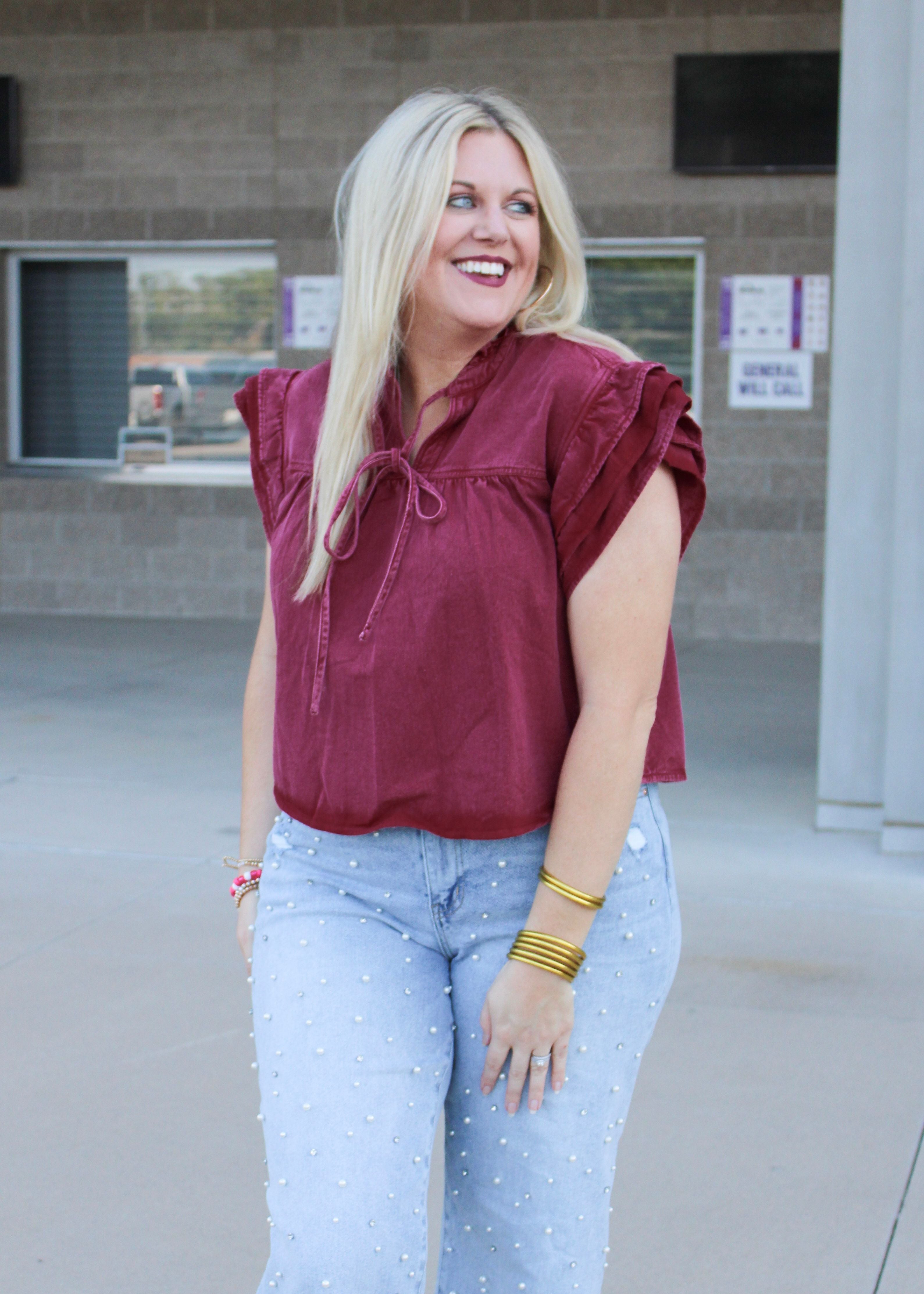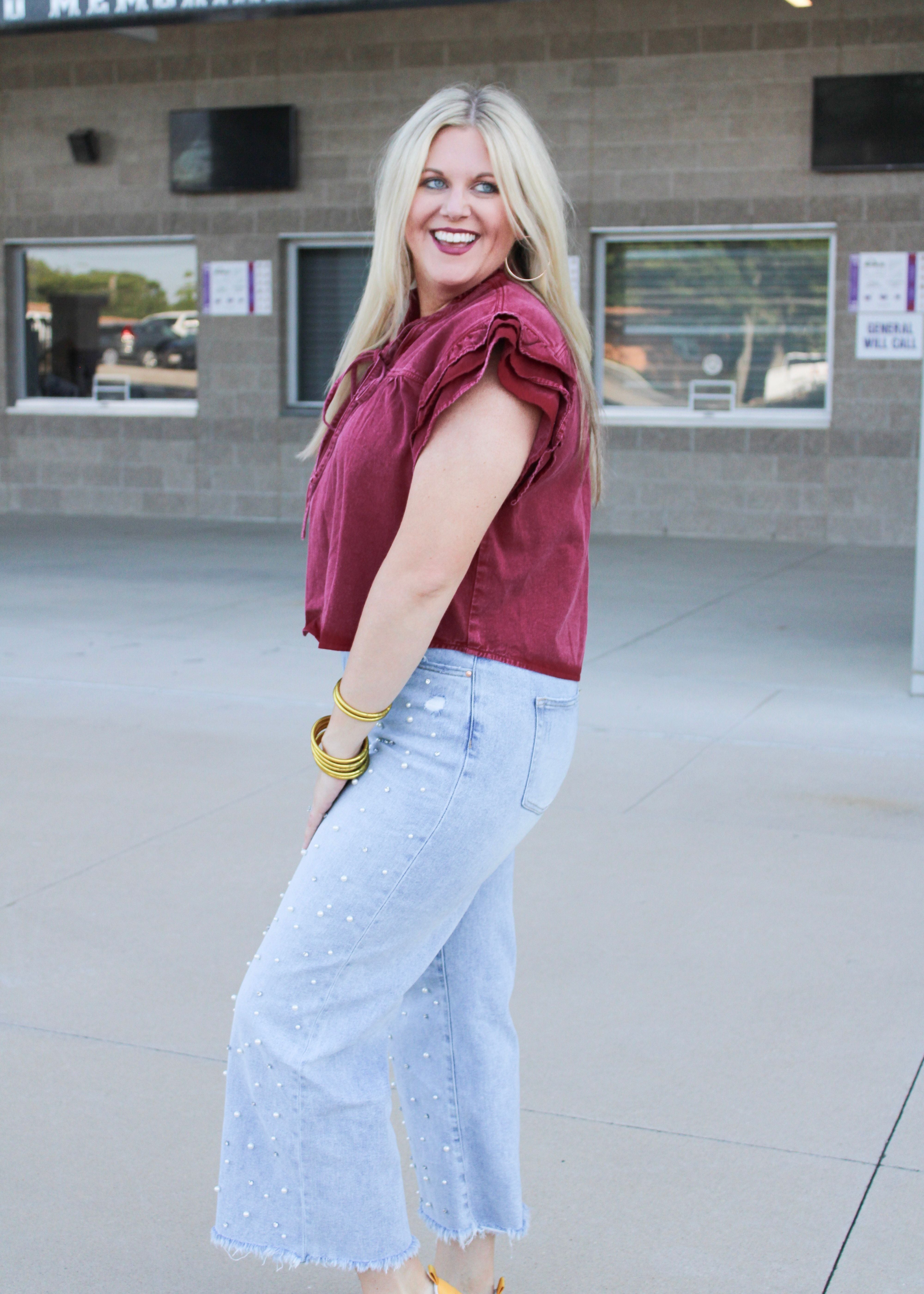Spirit and style wrapped all into one, paired with a cute denim skirt you've got the perfect outfit for the game or tailgate. This fun blouse is denim, front-tying, and pleated, and the perfect shade of maroon.